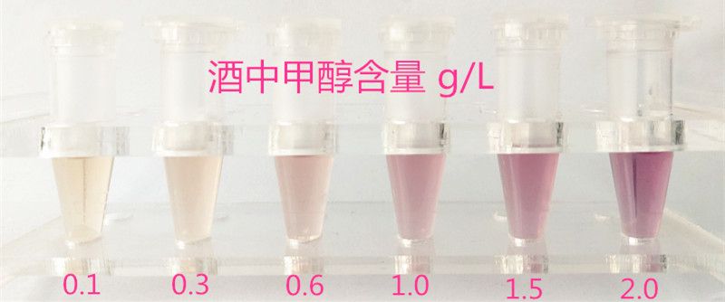 4 结果判断:酒中甲醇的限量标准是以100%酒精度计算,当读取了色阶上标示的甲醇含量后,根据样品酒精度数,换算出100%酒精度时所相当的甲醇含量。比如读取的色阶上标示的甲醇含量约为0.6g/L,样品的酒精度为50%,换算(0.6g/L÷50%)后此样品的甲醇含量约为1.2g/L。